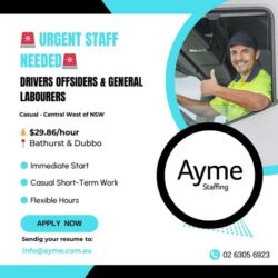 URGENT STAFF NEEDED DRIVERS OFFSIDERS & GENERAL LABOURERS Casual – Central West of NSW $29.86/hour Bathurst & Dubbo Immediate Start Casual Short-Term Work Flexible Hours APPLY NOW Sending your resume to: info@ayme.com.au 02 6305 6923