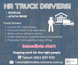 HR & HC Truck Drivers Wanted Monday- Friday AM & PM shifts Start times available: HR: 6:30am/7:30am/7:30pm HC: 9:30am/10:00am/10:30am Located in Wacol Transporting parcels multi-drop delivery HC – $39.50 HR – Day shift: $37.50 Night Shift: $46.50 Must Haves: ASAP STARTS HC or HR licence Minimum of 6 Demerit points remaining. Email your CV to: […]