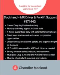 Chandler Macleod is on the lookout for a reliable **Allrounder Dockhand** in **Albury**! Do you have your **MR Licence** and **LF Licence**? Ready to join a well-established client in a hands-on, dynamic role? If this sounds like you, apply now via the link below! Looking for consistent work Mon–Fri? Dockhand – MR Driver & Forklift […]