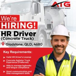 We’re HIRING! HR Driver (Concrete Truck) Gladstone, QLD, 4680 Key Requirements: – Valid HR Driver’s License – Concrete Agitator Truck Experience (Preferred) – Able to manage logbooks and fatigue compliance – Good communication and time management skills APPLY NOW +61 418 547 379 admin@aussietridentgroup.com.au Homestead Dr, Stalwyck QLD 4207, Australia