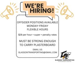 We are looking for strong and reliable offsiders to join our team! Email us if you think it could be you: glassontransporting@gmail.com (Based at Bulimba) WE'RE HIRING! OFFSIDER POSITIONS AVAILABLEMONDAY-FRIDAYFLEXIBLE HOURS $28 per hour + super + penalty rates MUST BE STRONG ENOUGH TO CARRY PLASTERBOARD EMAIL US: GLASSONTRANSPORTING@GMAIL.COM GLASSON TRANSPORTINGPLASTERBOARD CARRIERS