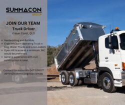 JOIN OUR TEAM Truck Driver Fraser Coast, QLD Hardworking and Reliable. Experienced in operating Truck n Dog, Water Trucks and Low Loaders Open HR license at a minimum, MC license will be preferred. General experience with civil construction is ideal. Contact for more info 0437699377 admin@summacongroup.com.au