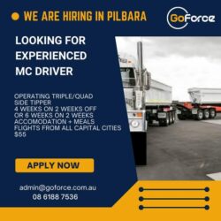 WE ARE HIRING EXPERIENCED MC TRIPLE/QUAD DRIVERS Days/nights, $62.56/hr Choice of 2/1 or 4/2 roster Pilbara location Direct flights to Perth or Brisbane Excellent accom/facilities Email nicky@mcrwa.au 0466 842100 Must have a minimum of 12 months triple/quad side tipper experience, able to complete mine spec medical, BFM, experience with remote work