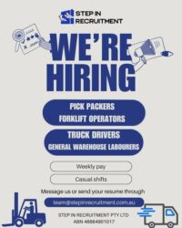 WE’RE HIRING PICK PACKERS FORKLIFT OPERATORS TRUCK DRIVERS GENERAL WAREHOUSE LABOURERS Weekly pay Casual shifts Message us or send your resume through team@stepinrecruitment.com.au STEP IN RECRUITMENT PTY LTD ABN 46664901017