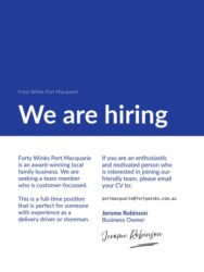 Forty Winks Port Macquarie We are hiring Forty Winks Port Macquarie is an award-winning local family business. We are seeking a team member who is customer-focussed. This is a full-time position that is perfect for someone with experience as a delivery driver or storeman. If you are an enthusiastic and motivated person who is interested […]
