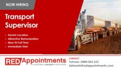 NOW HIRING Transport Supervisor > Darwin Location > Attractive Remuneration > Mon-Fri Full Time > Immediate Start RED Appointments CONTACT Tahnee | 0484 042 653 tahnee@redappointments.com