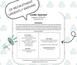 CP Recruitment is seeking a Front-End Loader based in the West. Details as per below. If interested, please send your resume through to info@cprecruitment.com.au. [#cprecruitment]() [#recruitment]() [#recruitmentlife]() [#RecruitmentExperts]() [#recruitingnow]() [#recruitmentagency]() [#westernsuburbsmelbourne]() [#westernsuburbs]() [#frontendloaders]() [#tickets]() [#frontendloader]() [#frontendloaderoperator]() CP RECRUITMENT URGENTLY SEEKING Loader Operator Truganina, 3029, VIC Casual | On-site Our valued Client has been operational since […]