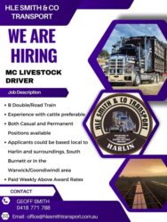 HLE SMITH & CO TRANSPORTWE ARE HIRINGMC LIVESTOCK DRIVER Job Description – Double/Road Train– Experience with cattle preferable– Both Casual and Permanent Positions available– Applicants could be based local to Harlin and surrounding areas, South Burnett or in the Warwick/Goodiwindi area– Paid Weekly Above Award Rates GEOFF SMITH 0418 771 788 Email – office@hlesmithtransport.com.au