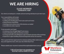WE ARE HIRING GLASS WORKER TAMWORTH, NSW Our clients are looking for a reliable and hard working individual to join their team. Your responsibilities will include: – Glass cutting and processing – Loading and unloading glass from trucks and trucks – General factory hand duties – Assisting around various areas of the business as needed […]