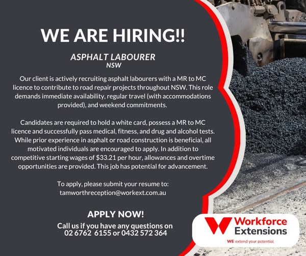 Asphalt Labourer: Assist with road repair projects in NSW, requiring MR to MC licence and immediate availability.