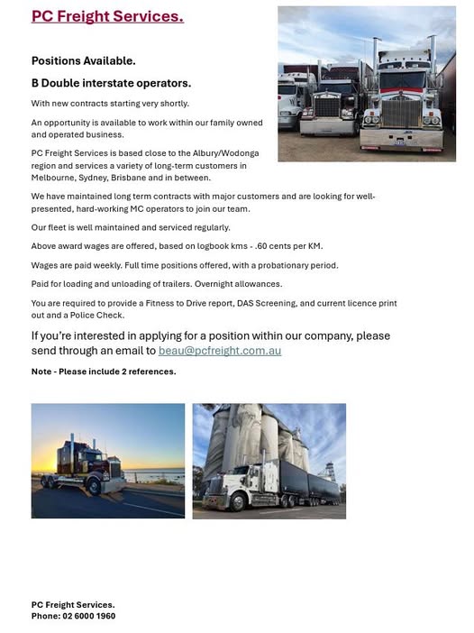 PC Freight Services is seeking to add to our team of experienced drivers and are looking for well-trained, Sydney, Brisbane and interstate drivers.