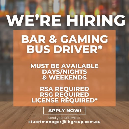 Bar and gaming bus driver needed, RSA/RSG required, flexible shifts, apply with resume.