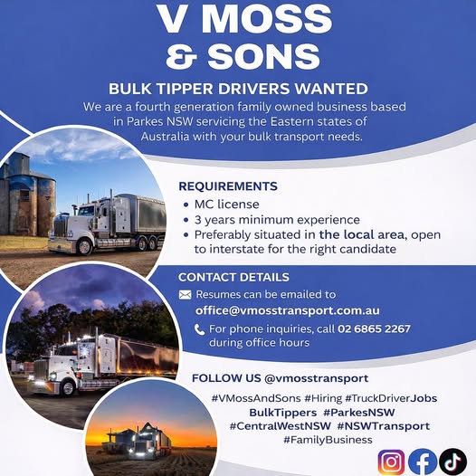 V Moss & Sons is seeking experienced MC drivers to join our Parkes-based family business servicing the Eastern states of Australia.