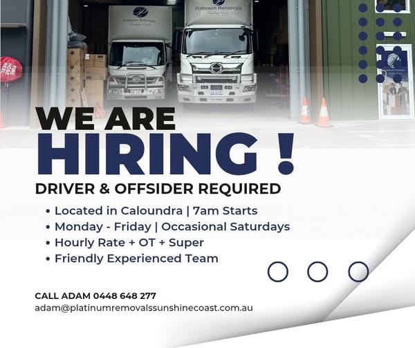 Job Tags:CALOUNDRA, HR Licence, MR Licence, No Drivers Licence, Platinum Removals Sunshine Coast.