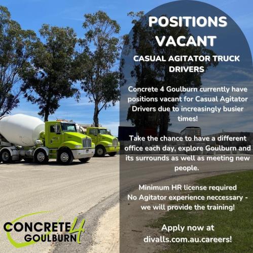 Concrete 4 Goulburn currently have positions vacant for Casual Agitator Drivers due to increasingly busier times!