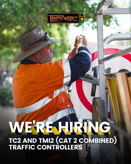 Hiring TC2/TMI2 Traffic Controllers in Darwin NT. Join Trafficwerx NT to manage traffic and keep roads safe on work sites. Must hold TC2/TMI2 tickets; send tickets and resume to media@twxnt.com.au