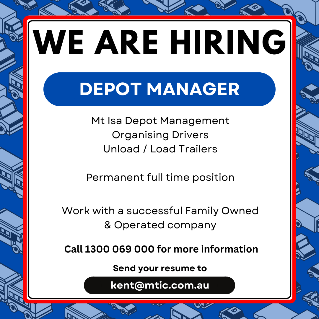 We are looking for a Depot Manager for our Mt Isa Depot! If you think you have what it takes and are looking for a permanent full time position – then apply now or call 1300 069 000 for more details.