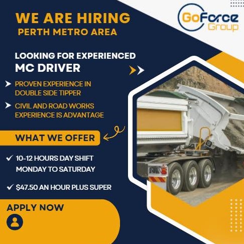 GoForce is seeking experienced MC Drivers for a role in the Perth Metro area operating a double side tipper.