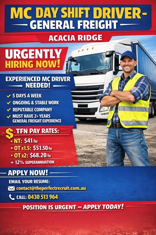 Experienced MC driver needed for 5-day shifts, with stable work and TFN pay rates ($41-$68.20/hr).