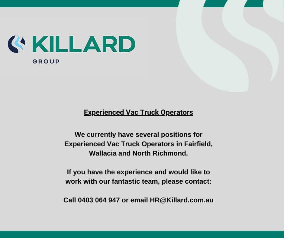 We currently have several positions for Experienced Vac truck operators in Fairfield, Wallacia and North Richmond.