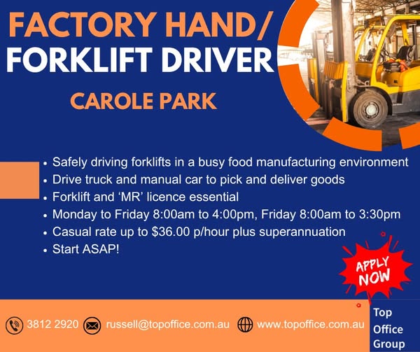 "Factory Hand/Forklift Driver needed for busy manufacturing environment, driving forklifts and trucks, with MR licence, $36/hour + super."