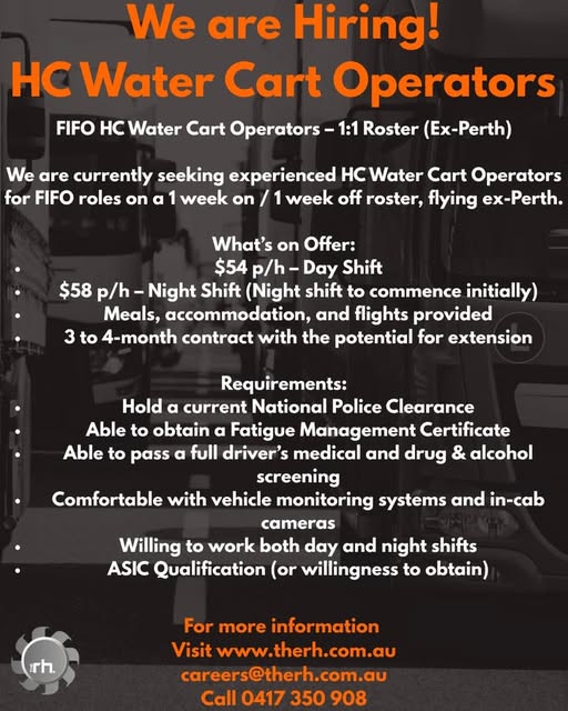 We are currently seeking experienced HC Water Cart Operators for FIFO roles on a 1 week on / 1 week off roster, flying ex-Perth.