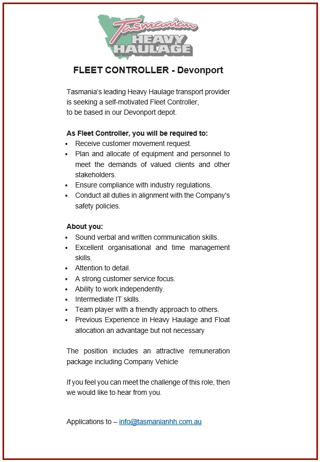 Tasmania's leading heavy haulage transport provider is seeking a self-motivated Fleet Controller to be based in our Devonport depot.