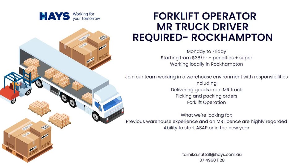 Forklift Operator & MR Truck Driver needed in Rockhampton, delivering goods, operating equipment, with $38/hour + penalties.