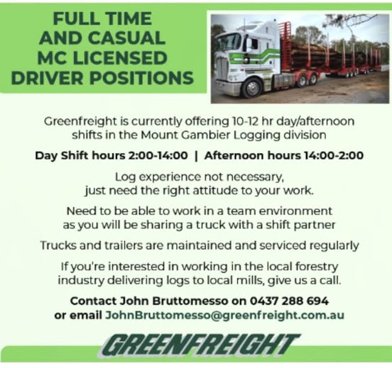 If you’re interested in working in the local forestry industry please contact John Bruttomesso on 0437?288?694 or email JohnBruttomesso@greenfreight.com.au.