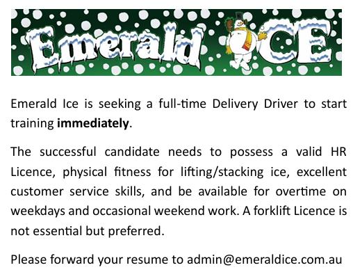 "Join Emerald Ice as a Delivery Driver & lift, stack ice with ease. Valid HR Licence & excellent customer service skills required."