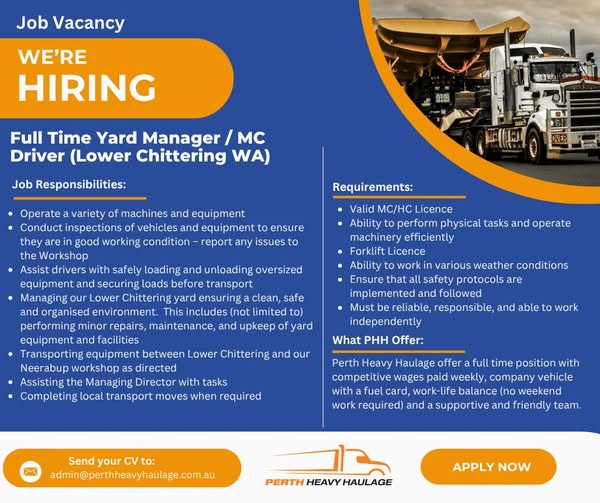 Perth Heavy Haulage is on the lookout for a self-driven and proactive Yard Manager who is enthusiastic about taking on various tasks to ensure our yard in Lower Chittering runs smoothly. If this describes you and you are in search of a new challenge, reach out to us today!