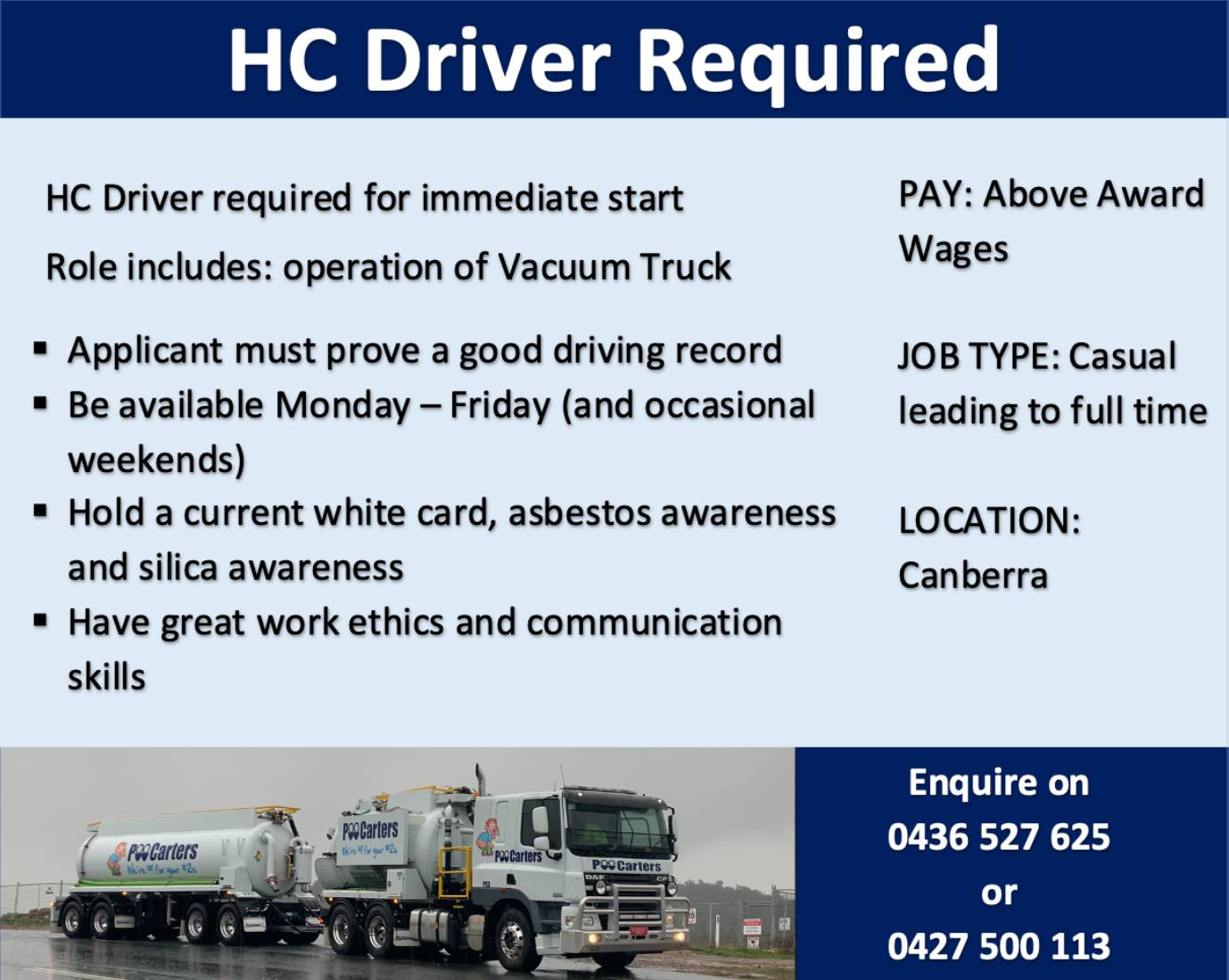 Job Tags:CANBERRA, HC Licence, Poo Carters.
