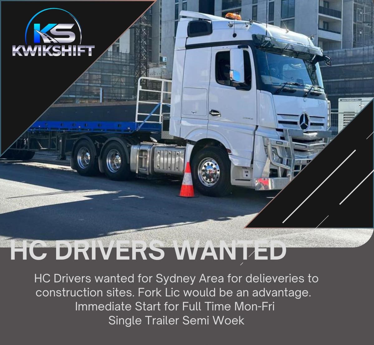 HC Drivers wanted for Sydney area for deliveries to construction sites. Fork licence would be an advantage. Immediate start for full time Mon-Fri. Single Trailer Semi work.