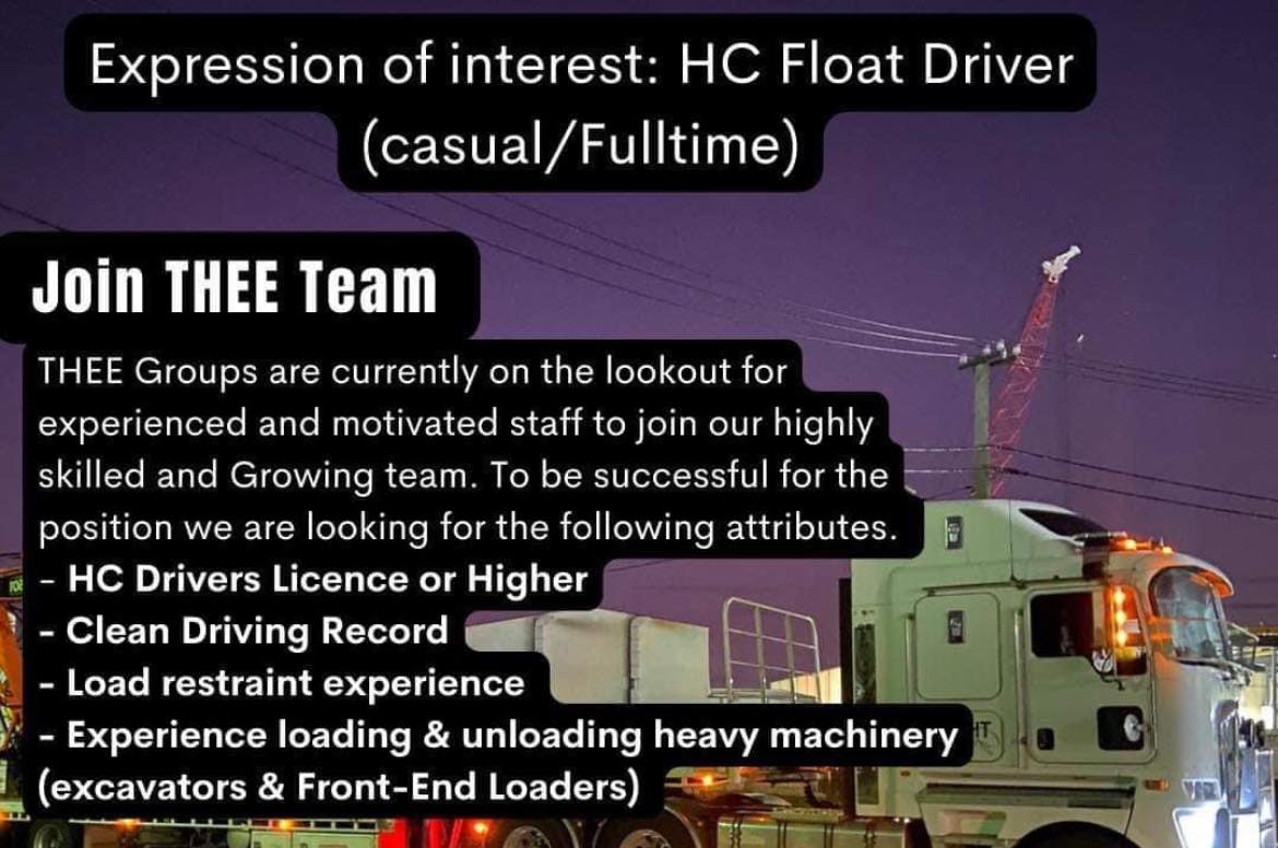 THEE Group is currently on the Look out for a HC Float Driver based out of our Rutherford NSW Depot