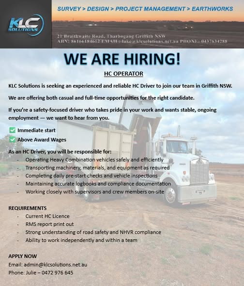 KLC Solutions is seeking an experienced and reliable HC Driver to join our team in Griffith NSW.