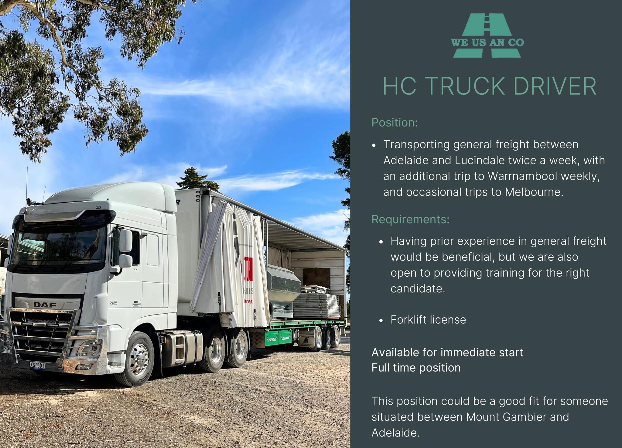Job Tags:HC Licence, MOUNT GAMBIER, We Us An Co Transport.