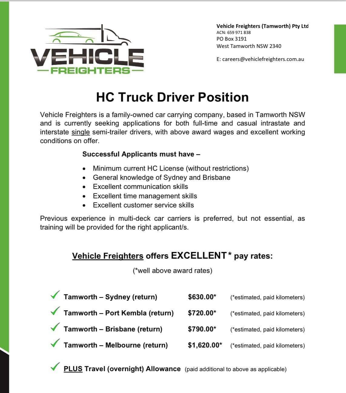 HC Truck Driver Position ( Vehicle Freighters (Tamworth) Pty Ltd )
