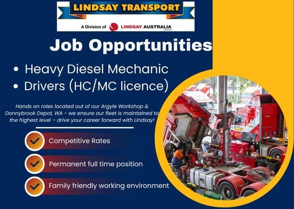 Heavy Diesel Mechanic & HC/MC licensed drivers needed for permanent, family-friendly roles at Lindsay Transport, WA.