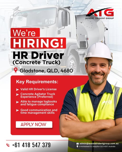 Concrete truck driver with HR license & experience in logbook management required for Gladstone, QLD.