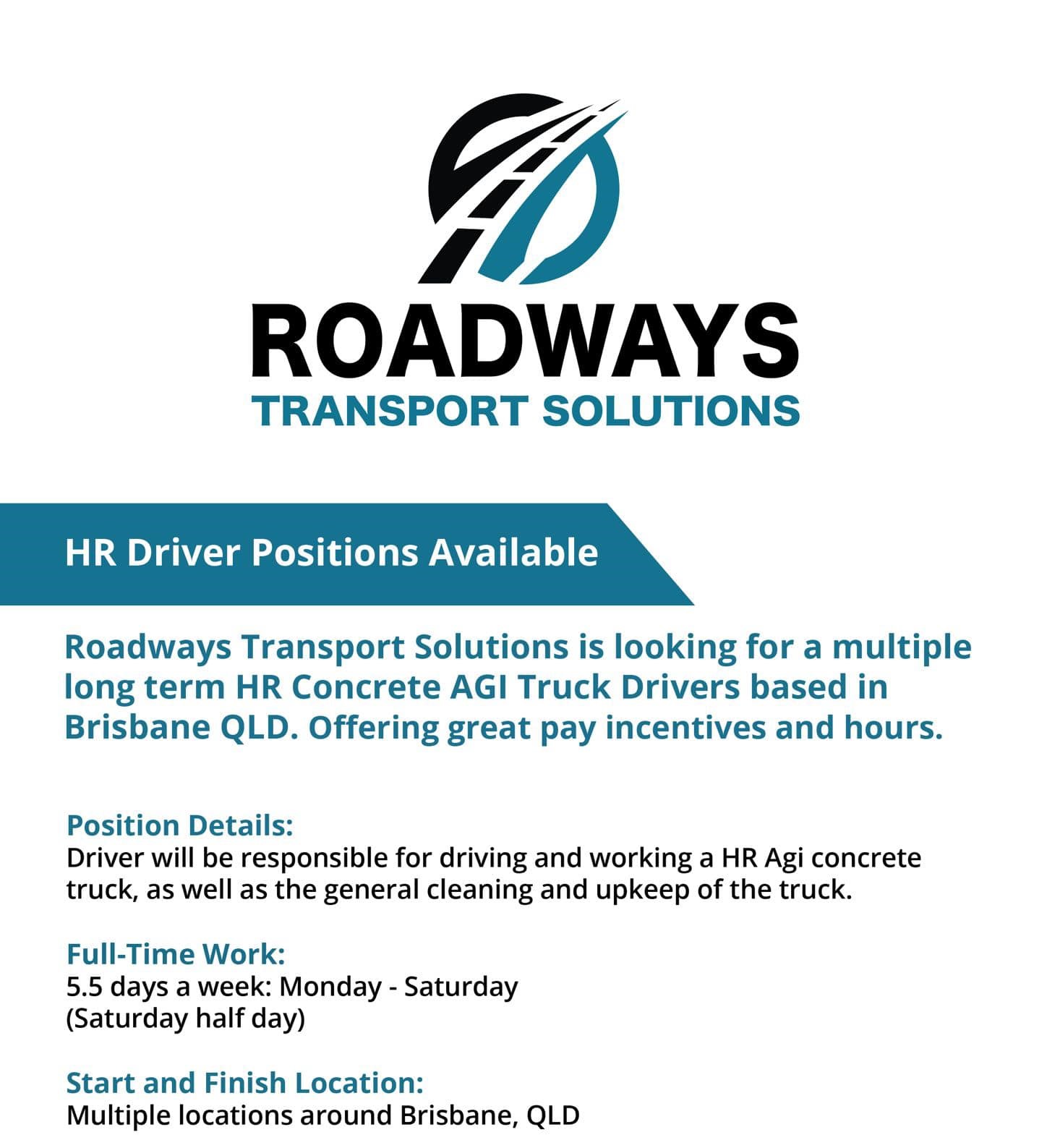 Roadways Transport Solutions is looking for a multiple long term HR concrete AGI truck drivers based in Brisbane, QLD. Offering great pay incentives and hours.