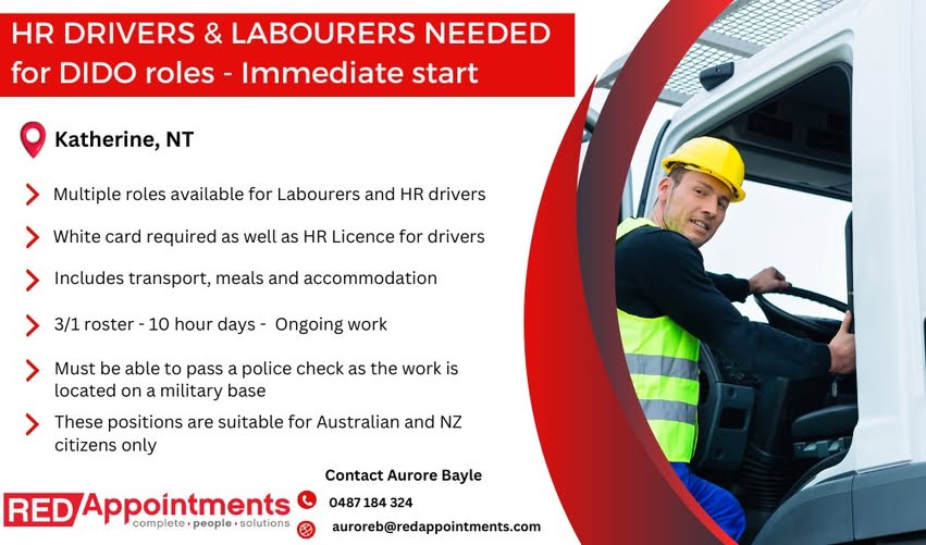 "Labourers & HR drivers needed for ongoing DIDO roles with transport, meals & accommodation. White card & HR licence required."