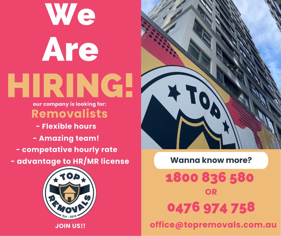 For over 14 years, Top Removals has been dedicated to delivering exceptional service to our incredible Melbourne community. Now, as we embark on an exciting expansion, we’re on the hunt for our next team members! Do you have what it takes to be part of our dynamic crew? Apply now!