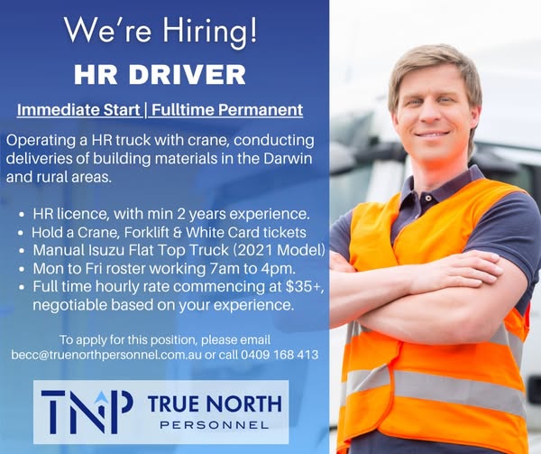 "Operate HR truck with crane for building material deliveries in Darwin & rural areas, requiring HR licence and relevant tickets."