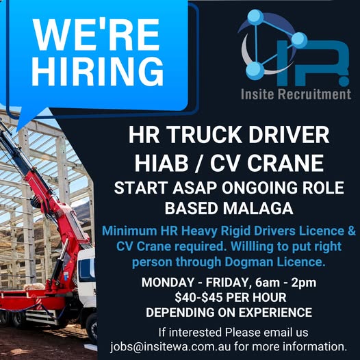 Minimum HR Heavy Rigid Drivers Licence & CV Crane required. Willing to put right person through Dogman Licence.