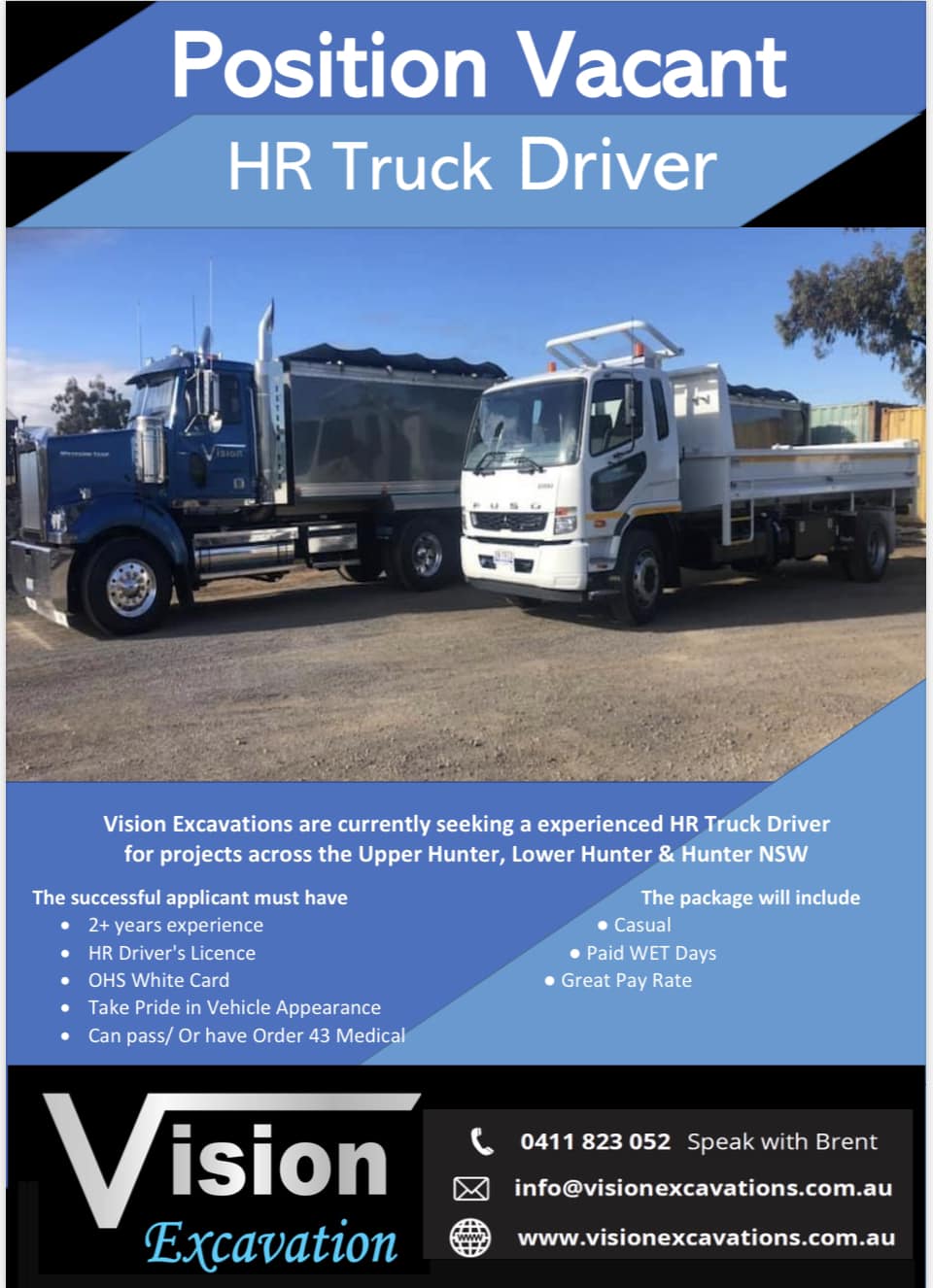 Vision Excavations are currently seeking a experienced HR Truck driver for projects accross the Upper Hunder, Lower Hunter & Hunter NSW.