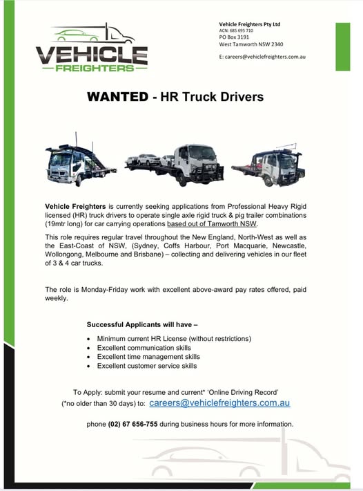Vehicle Freighters is currently seeking applications from Professional Heavy Rigid Licensed (HR) truck drivers to operate our fleet of trucks servicing areas east of Tamworth NSW.