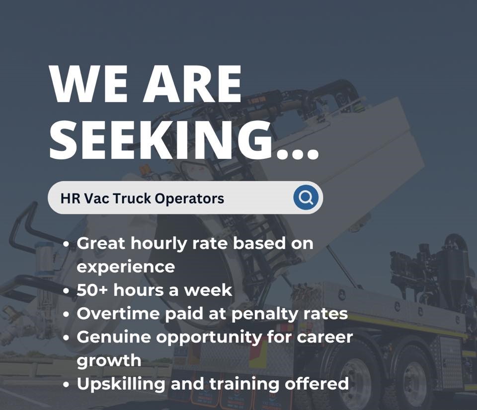 HR Vac truck operators required for immediate start. Plenty of overtime paid at penalty rates.