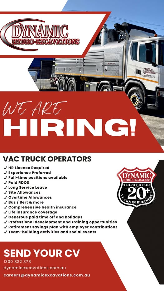 Full-time truck operators needed for dynamic excavation company, offering benefits like paid RDOs, long service leave & professional development opportunities.
