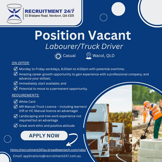 Recruitment 24/7 has a new vacancy for Labourers/Truck Drivers, for our client based in Wacol.