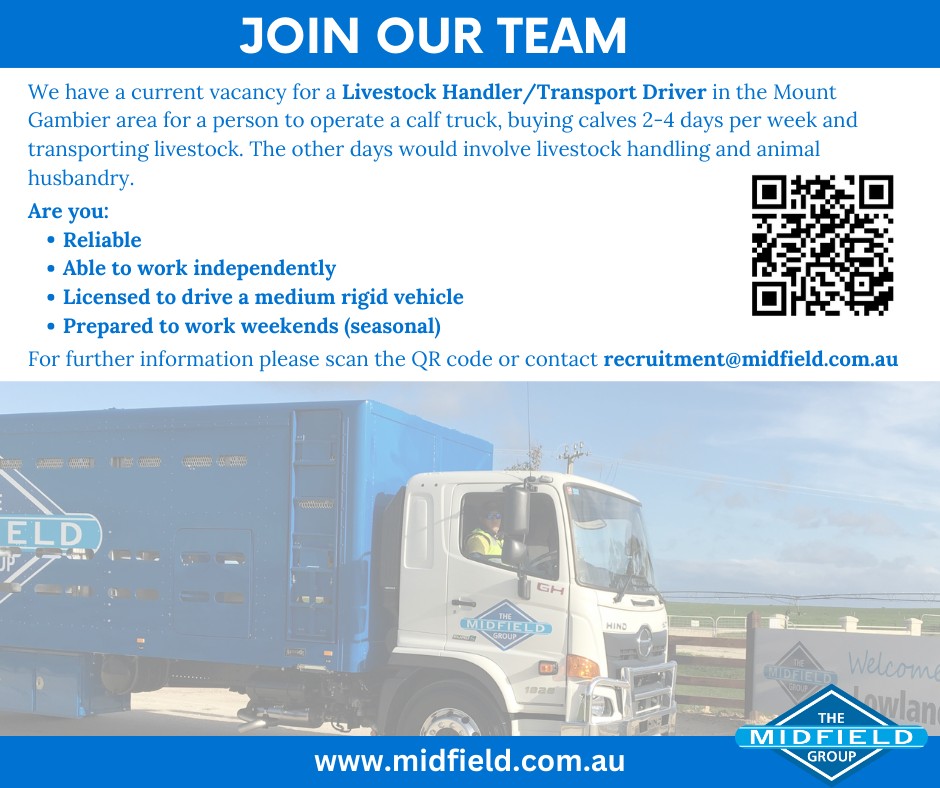 We have a current vacancy for a Livestock Handler/ Transport Driver in the Mount Gambier area for a person to operate a calf truck.
